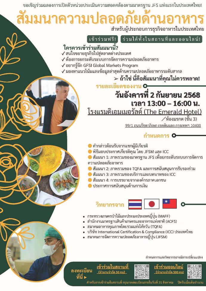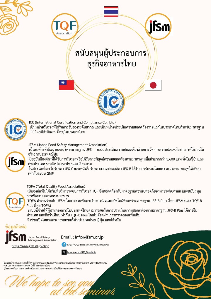 ฟรี!! งานสัมมนาความปลอดภัยด้านอาหาร พร้อมการเปิดตัวหน่วยตรวจประเมินมาตรฐาน JFS แห่งแรกในประเทศไทย !!